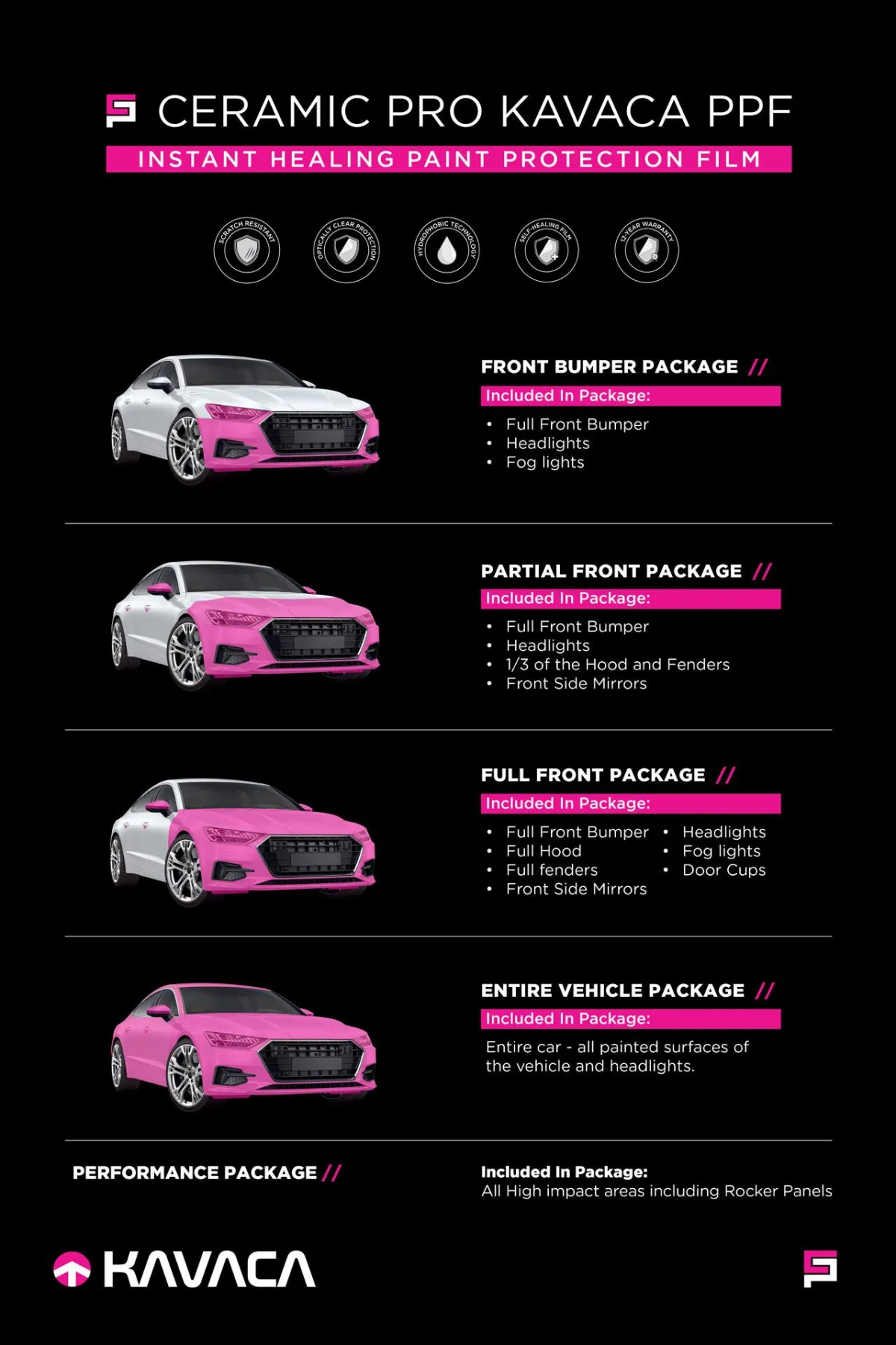 KAVACA Ceramic Coated PPF gives your vehicle the ultimate protection package with ceramic-infused film.